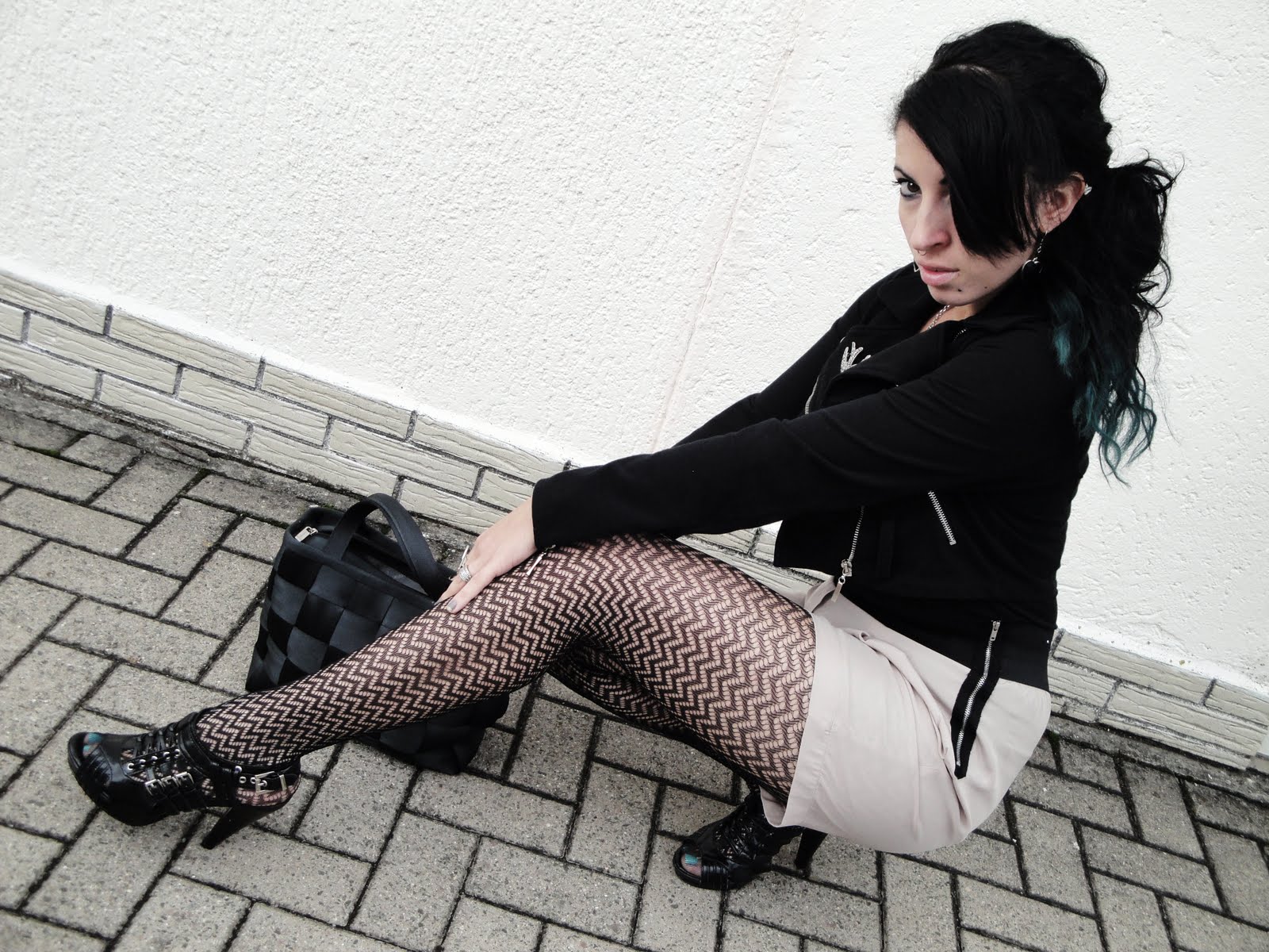 Jacket from Wet Seal. Tights from F21. Shorts from the BX (surprise there!). Shoes by dollhouse from DSW. Harvey's Seatbelt bag.